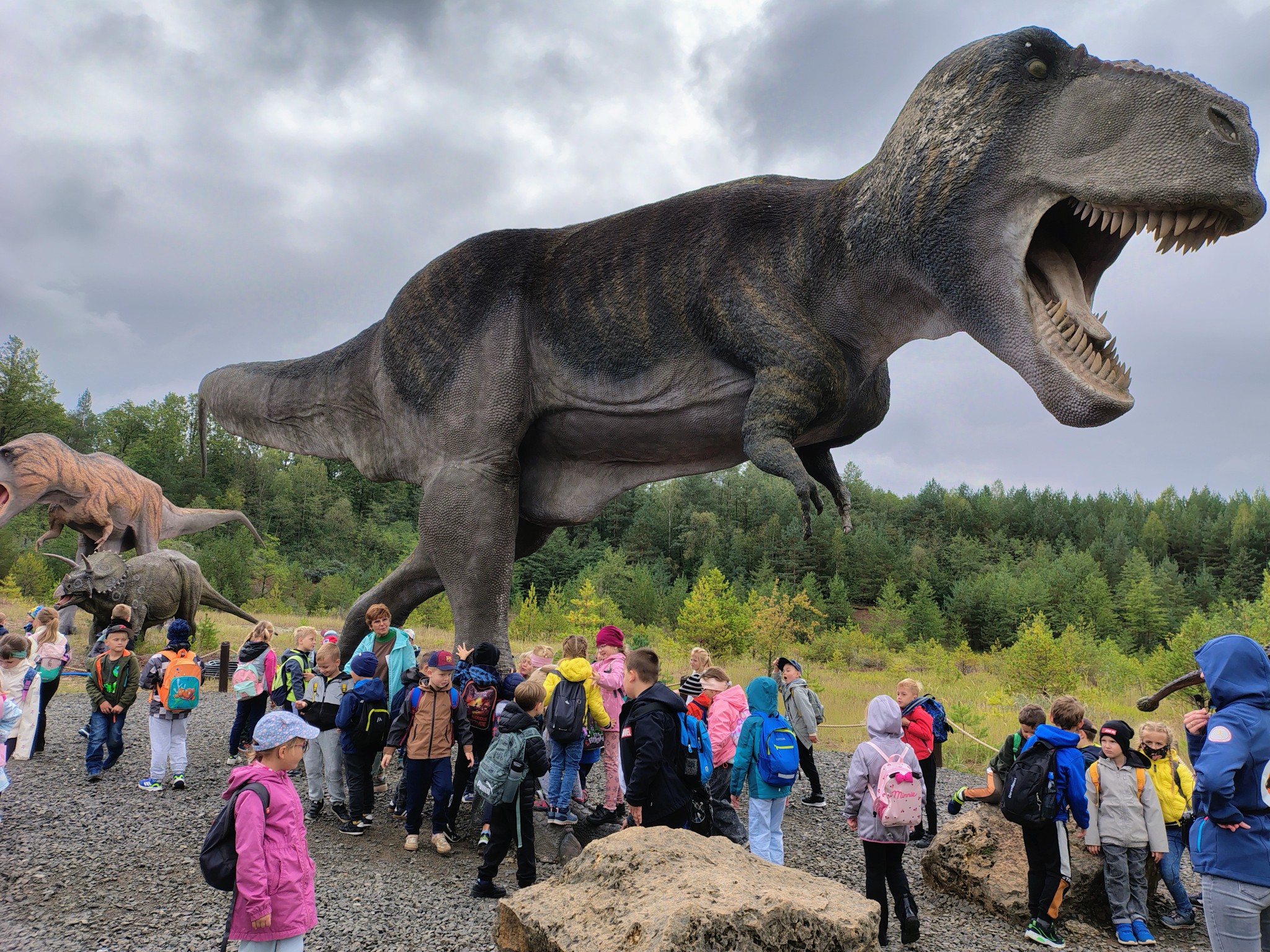 JuraPark Krasiejów jest największym parkiem dinozaurów w sieci JuraPark, powstał w miejscu, w którym odnaleziono setki kości prehistorycznych płazów i gadów. To niezwykłe muzeum paleontologiczne połączone z parkiem rozrywki umieszczone na ciągle aktywnym terenie wykopalisk paleontologicznych w Krasiejowie jest wspaniałym miejscem do poznania historii naszej planety. Można również tutaj wspaniale spędzić czas, korzystając z wielu atrakcji jak plac zabaw i park rozrywki. I chociaż prognozy pogody nie były zachęcające to zwiedzania, to jednak na miejscu słoneczko zaświeciło dla pierwszoklasistów. Nasi najmłodsi uczniowie dzielnie pokonali tunel czasu i dzielnie przeszły całą trasę zwiedzania poznając kolejne dinozaury. Na zakończenie wycieczki wykorzystali atrakcje na placu zabaw oraz zakupili sobie niewielkie pamiątki z tego ciekawego miejsca.