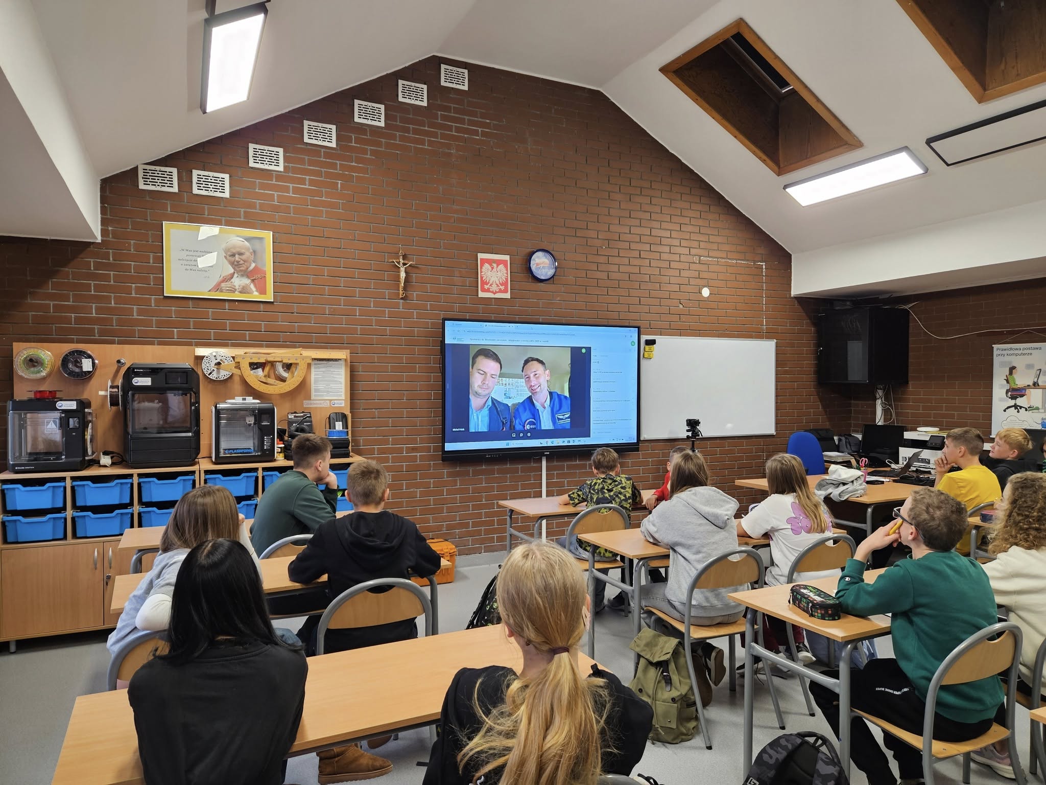 W poniedziałkowy poranek uczniowie naszej szkoły mieli okazję wziąć udział w wyjątkowym wydarzeniu. Podczas Expo 2025, które odbyło się w Japonii, zorganizowano spotkanie online z panem Sławoszem Uznańskim-Wiśniewskim – polskim astronautą i naukowcem. W wydarzeniu uczestniczyli chętni uczniowie, którzy z ogromnym zainteresowaniem wysłuchali inspirującej rozmowy. Pan Uznański-Wiśniewski opowiedział o swoich pasjach i zainteresowaniach, które doprowadziły go do osiągnięcia tak imponującego sukcesu, jakim był udział w misji kosmicznej. Podzielił się również swoimi przeżyciami i refleksjami związanymi z pobytem w przestrzeni kosmicznej, co wywarło na wszystkich ogromne wrażenie. Na zakończenie spotkania skierował do uczniów dwie ważne rady: uczyć się systematycznie oraz współpracować ze sobą, ponieważ właśnie te wartości jego zdaniem prowadzą do realizacji marzeń i osiągania życiowych celów. „